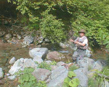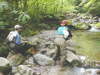| 2002年 8/25 禁漁まで秒読み、川野さんが遊びに来るとのことで、前回川野さんが単独でいい釣りをした近くの里川へ、早朝に待ち合わせ、入渓、この川は入退渓がとても楽で、温泉もあり、魚の数は解禁から禁漁まで全く心配が無い、危険な箇所も皆無。まさに私向きか? 前々日まで続いた雨のせいで、いつもよりは倍近い水量でいつになく遡行が大変です。そうこの川の欠点、石がとにかく滑るのです。水が少ない時はそうそう足を取られないのですが倍近いとなると状況は変わってきます。曇天で涼しいのが救いです。アブ、虫も殆ど見かけません。しかし魚の反応はすこぶる良く、さすがこの川、僕は暫く岩魚の釣りが 続いたのでなかなか合わせが決まりません。川野さんの的確な合わせに一歩遅れを取ってしまいます。型がちょつと小さいなあ。しかし川野さんと釣りをする様になってこの一年半、川野さん旨くなったよねぇー。年の功か? この川のフライはEHCがベストです。サイズは12-18番、ブリーチドの白いものが好反応、欲を出してナチュラルに変えると反応が薄くなります。川幅も狭い為、僕自身は14ftまでのシステムで充分かと思います。まあ最近グラスのショートロット゛ばかり使用しているので余り長いのは使いにくいのも事実なんですけどね、その分ライン操作、トリックキャストが増えて面白い?(せわしい、難しいとも言う)。 |
